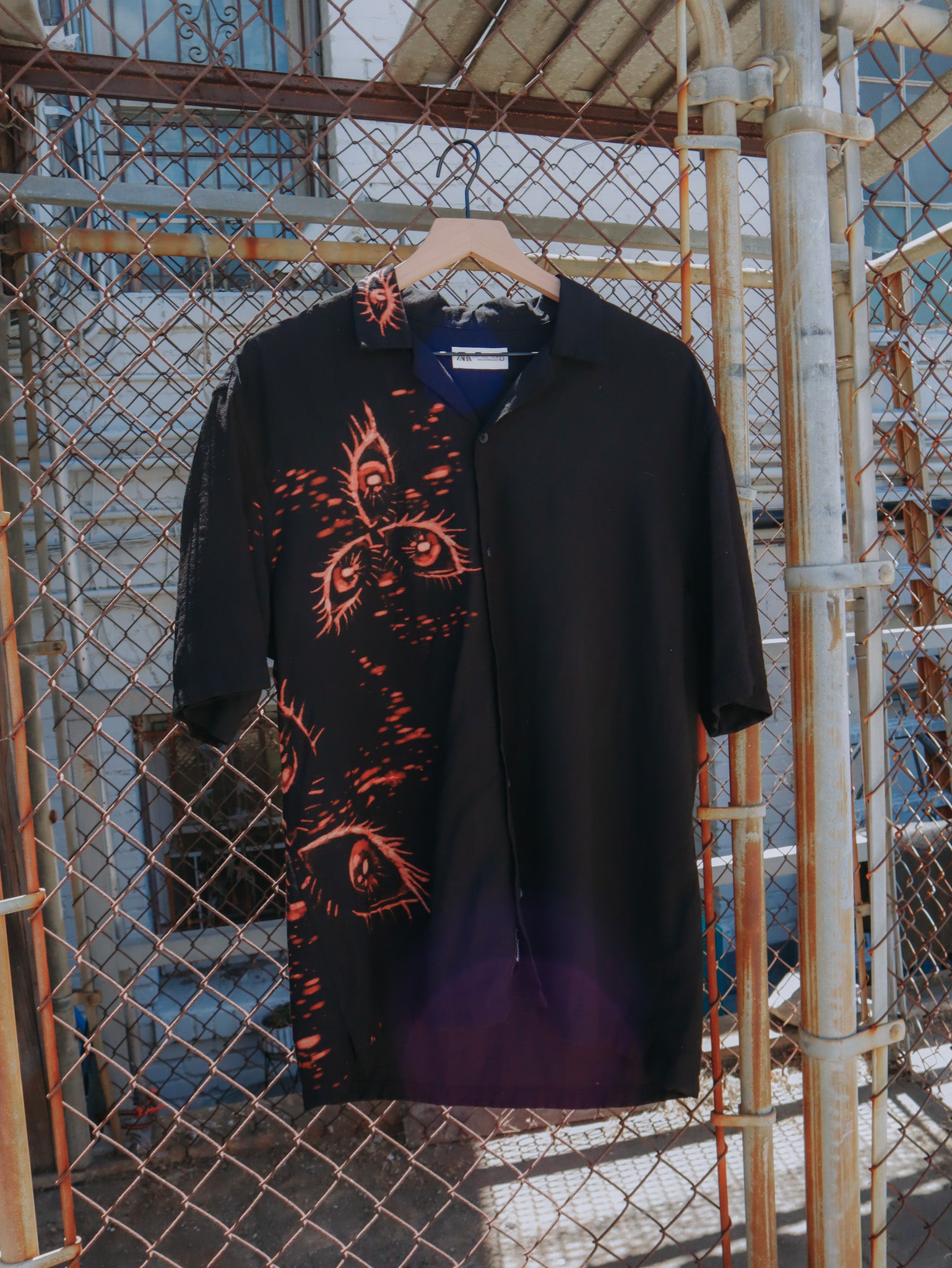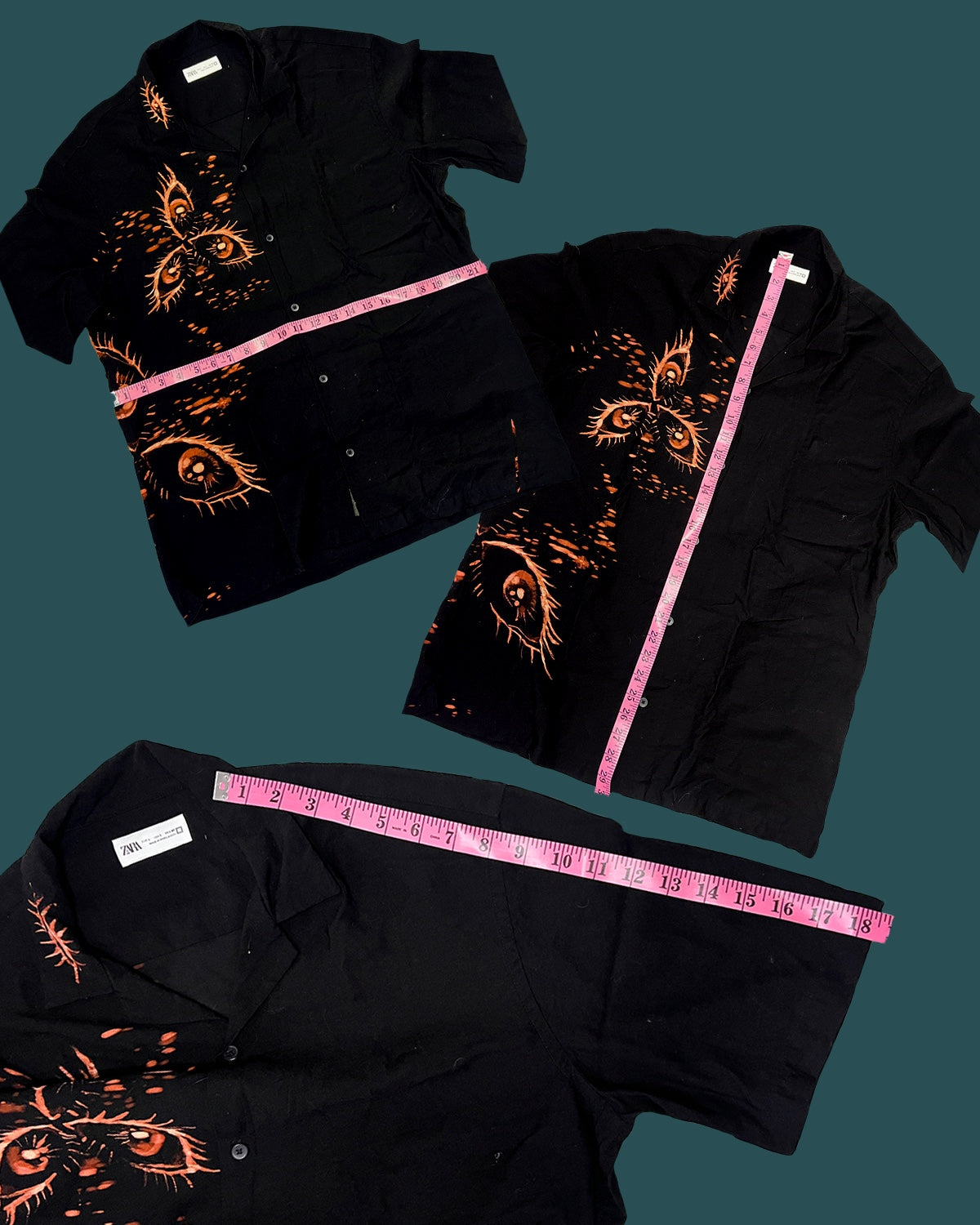 This is a one-of-a-kind upcycled thrifted piece that has been painted on with bleach to create visually engaging eye designs. This button-down shirt is a size L under the manufacturer Zara. Measurements are included in the last few images.