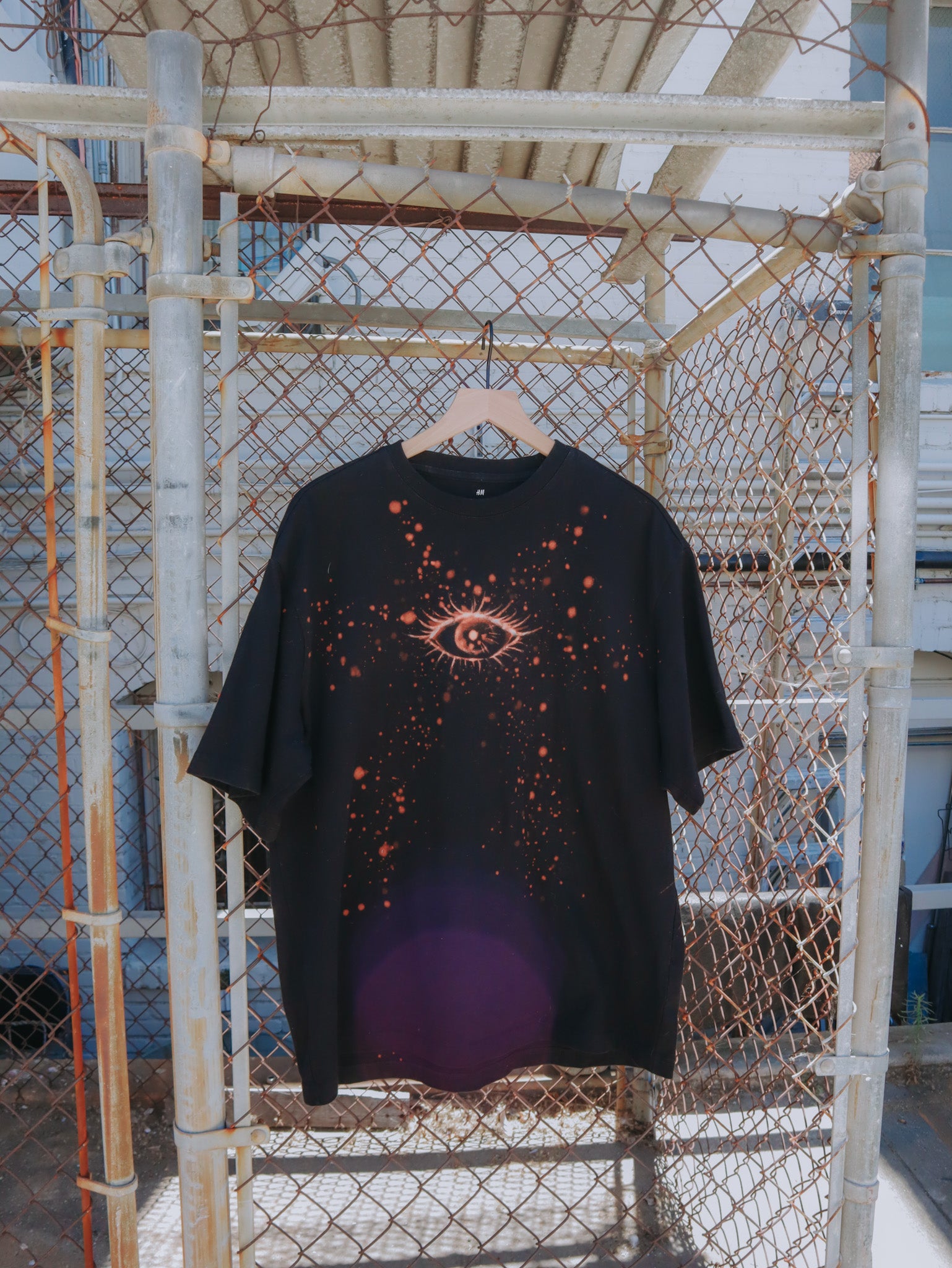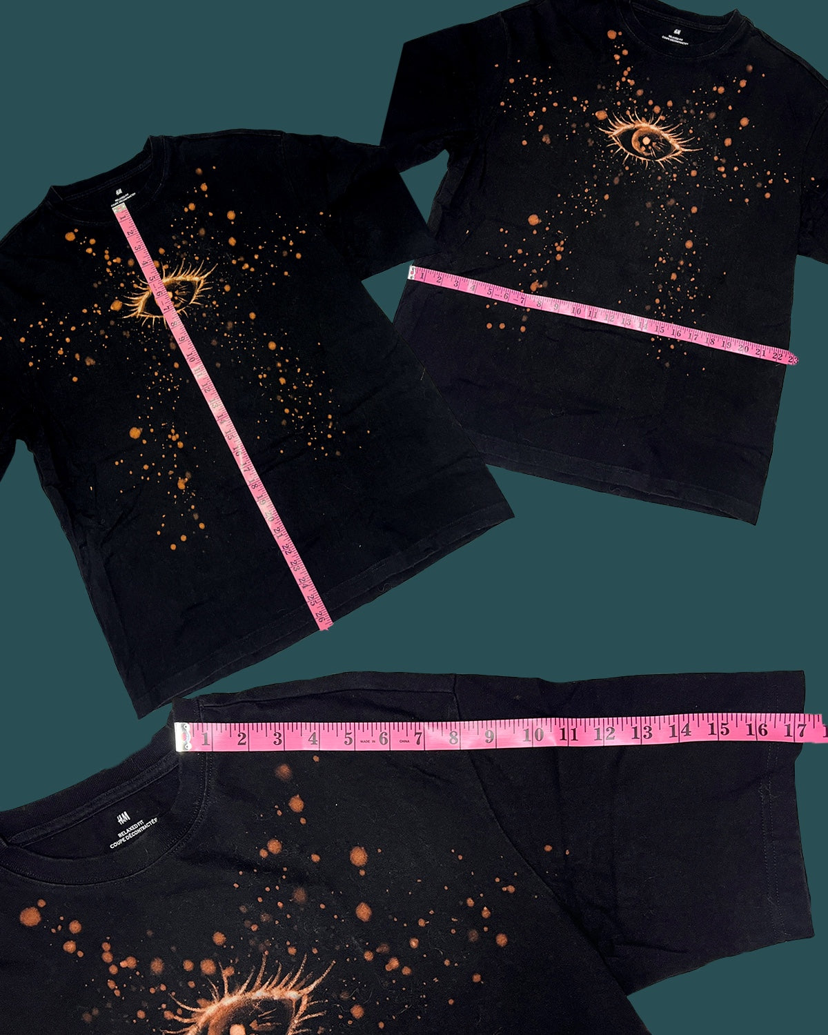 This is a one-of-a-kind upcycled thrifted piece that has been painted on with bleach to create visually engaging eye designs.  This shirt is a size L relaxed fit under the manufacturer H&M.  Measurements are included in the last few images.