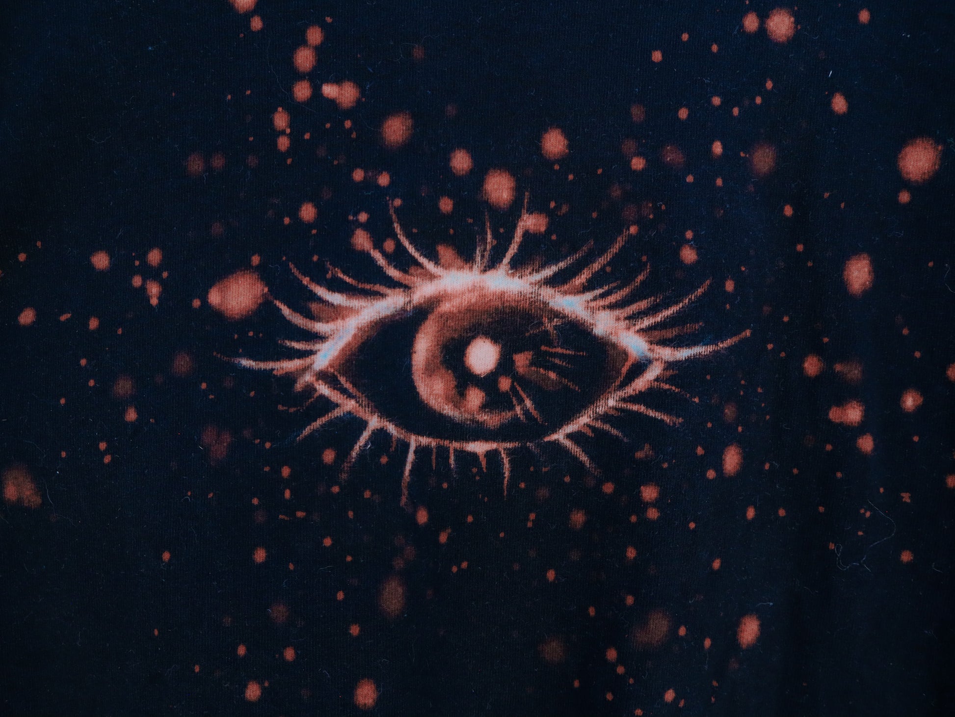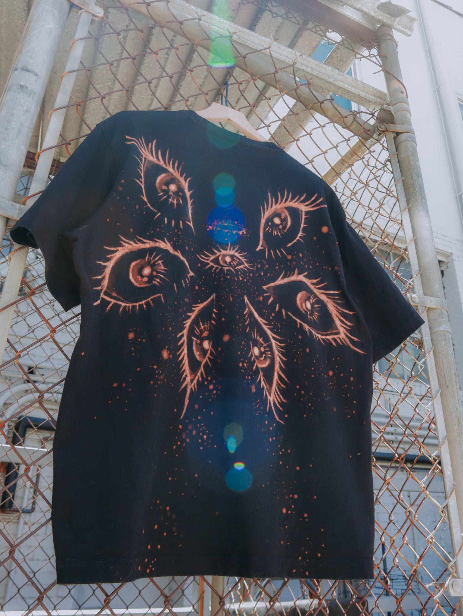 Painting with bleach on clothing was on my creative bucketlist for awhile.  I didn't know what kind of design I wanted to do.  Finally I settled on eyes because they are a constant motif in my work.  It's the default thing I draw whenever I start doodling and is something that I love to illustrate over and over.  Each eye is hand-painted and unique; no two eyes are the same.