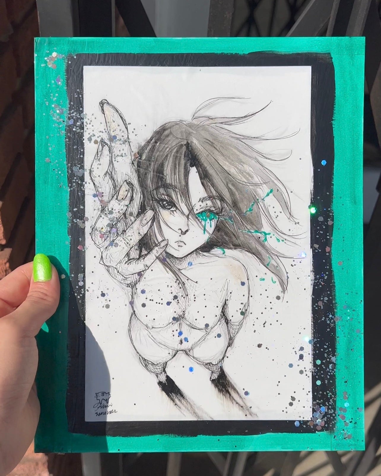 This is a one-of-a-kind mixed media art piece. Dimensions are 8x10. Art is handdrawn on Canson sketch paper which is mod podged with glitter onto chipboard. If you would like to see how it's made link is below: